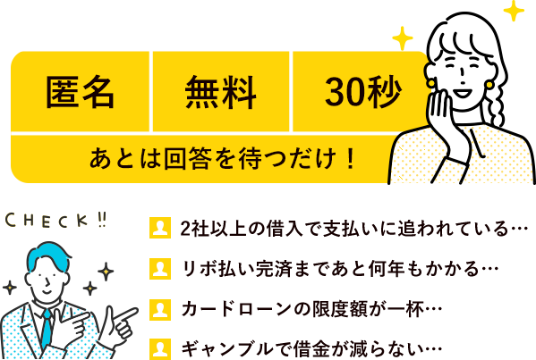 上記に、1つでも当てはまるならリボ・借金がいくら減額できるかまずはお気軽にチェック!!
